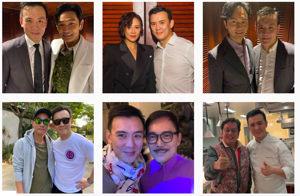 在他的社交账号里,几乎全是和港圈明星们的合照,从老一辈的谢贤、狄波拉、谭咏麟,到大家熟悉的关之琳、陈小春、宣萱、古天乐、刘嘉玲、谢霆锋、杜德伟、张智霖等等,都是与他合照过。这些照片也透露出爱德华纷歧般的身份与人脉。