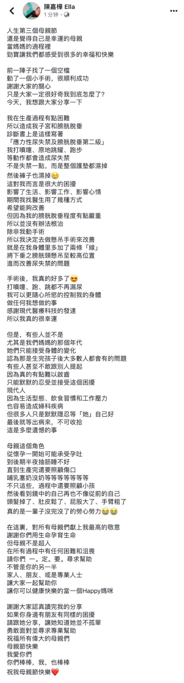 事实上,娱乐圈不少明星妈妈都有同样问题,但勇敢说出来的人不多,印象中只有ella陈嘉桦及马伊琍在微博上谈论此事,ella还做了手术改善尿失禁,她呼吁有同类问题的妈妈不要害怕。