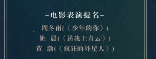 其中第二届最佳电影表演奖(相当于“影后影帝”殊荣)的竞争格外激烈,提名的分别是姚晨、周冬雨以及黄渤。