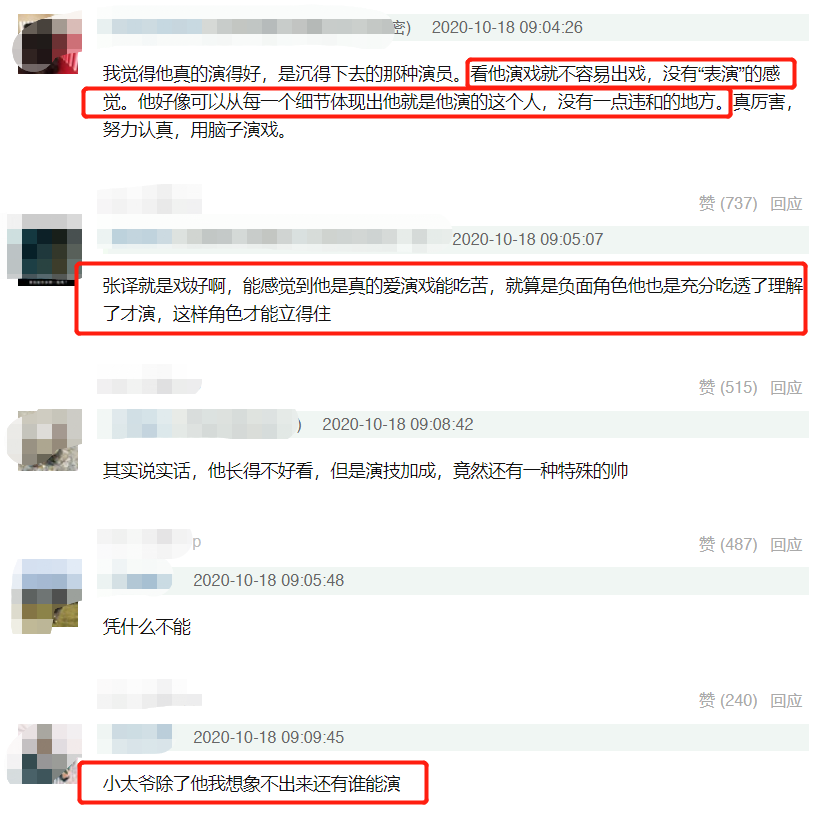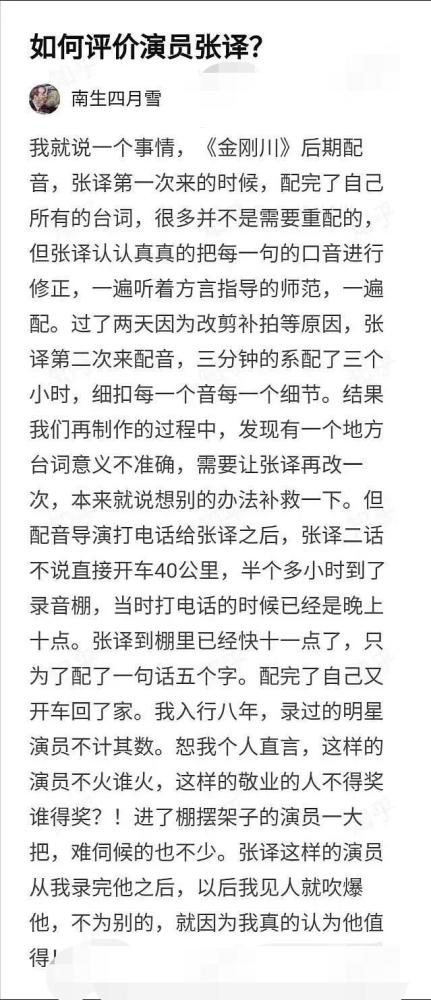 这两次配音足以证明张译的敬业程度,而以后因为有地方台词意义禁绝确,需要修改5个字。晚上十点多配音导演打电话给张译,听到要求后张译二话不说直接开车40公里到现场,重新配完这5个字,再驾车返回家中。这位工作职员感慨,自己入行8年,录过的明星不可胜数,但是像张译这样的屈指可数,因此他也感慨“他不火谁火”,同时还表示自己以后见人就吹爆张译,就因为他值得!
