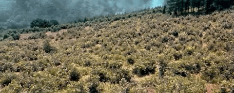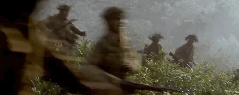 远处硝烟滚滚,随着哨声响起,绿色植被中隐现出成百的战士,疾速奔赴前线战场。