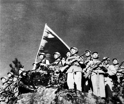布满381个弹孔的战旗飘扬在上甘岭主峰。