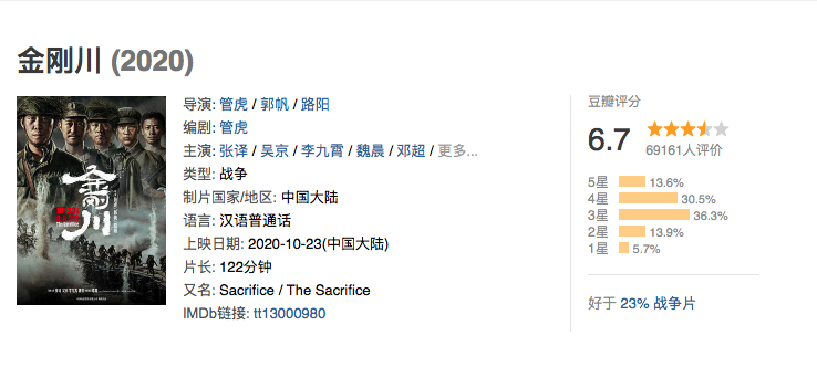 面对这样的斩新演绎方式,感觉并不行被观众所接受,所以《金刚川》总票房貌似很难超越《八佰》,而如今票房综合平台也发布了《金刚川》的综合评分数据才6.7分,那么张译当时夸下的海口是否被证实是“打脸”呢?