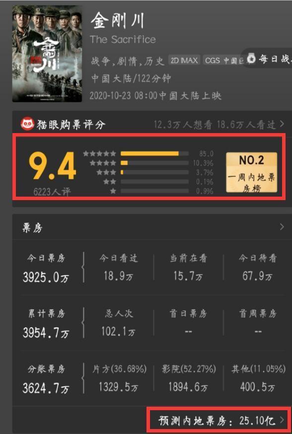 那么自从《金刚川》上映以来的这几天时间里,《金刚川》的网络评分数据始终维持在9.4分,这让很多不明真相的网友纷纷前去观看。那么如果从现在的整体水平来看确实能够和之前的《八佰》抗衡一下。