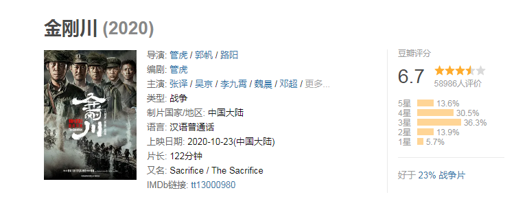 与票房大卖相反的是,《金刚川》在豆瓣的评分却已经跌至6.7分,截止目前,一共有58986名用户给《金刚川》打了分,其中打五星的占13.6%,打四星的占30.5%,打三星的最多,占36.3%,打两星的占13.9%,打一星的占5.7%,仅好过23%的战争片。