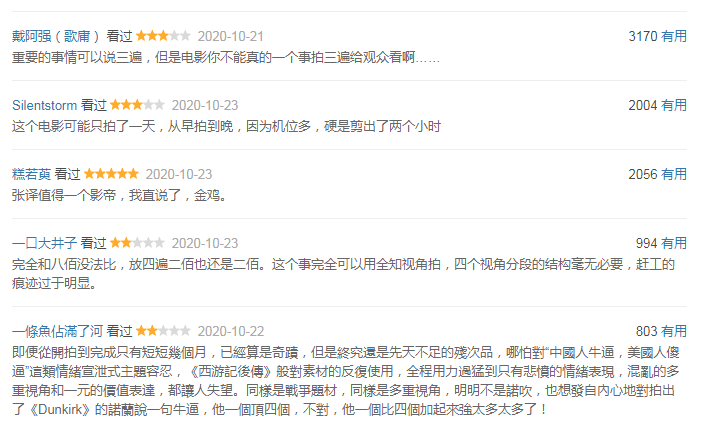 在评论区里,大多数的影迷都是在吐槽片子的结构,《金刚川》采用四个视角分段的结构,因此造成了一些镜头的重复,是的剧情显得有些无聊。有网友甚至吐槽,可能电影只拍了一天,因为机位比较多,所以硬剪出来了两个小时。