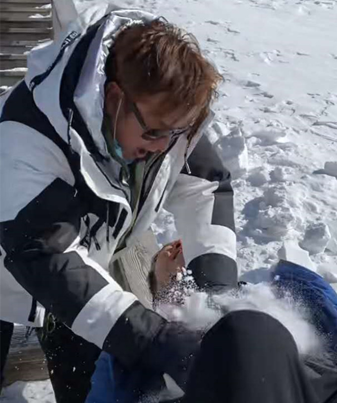 以后,谭咏麟不但和好友们打起了雪仗,还说要表演“胸口碎大石”。他先是让张智轩躺下来,然后拿出一块雪,在张智轩胸前砸开,整个场面十分的搞笑。