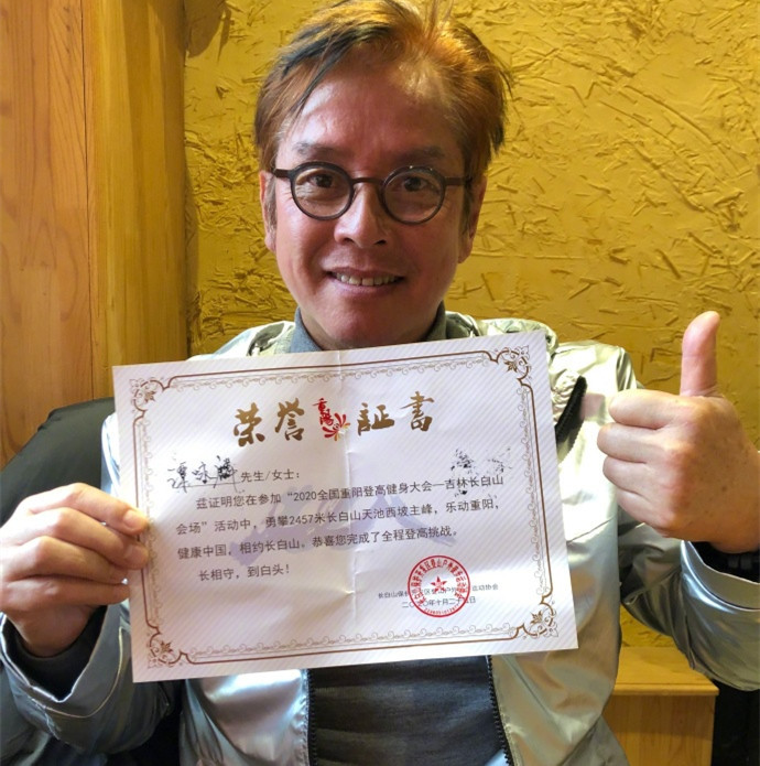 原来,谭咏麟趁着重阳节,率领张智轩、罗钧满等一众TVB配角和圈内好友一路去爬长白山了。从他晒出来的证书看,他成功登上了2457米的雪山,实在太厉害了。