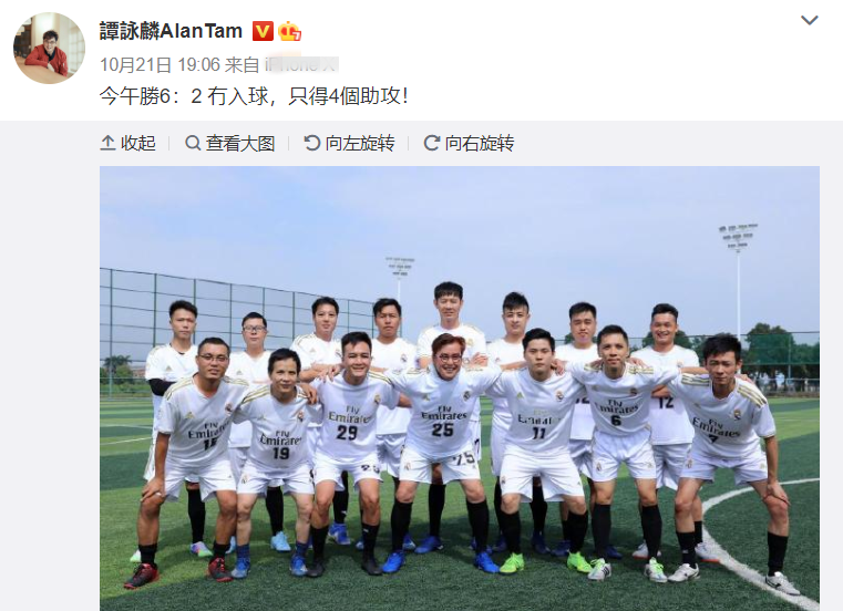 平日里谭咏麟经常晒出与圈中好友踢球的照片。几天前的一场球赛中,谭咏麟就为队友完成了4个助攻。