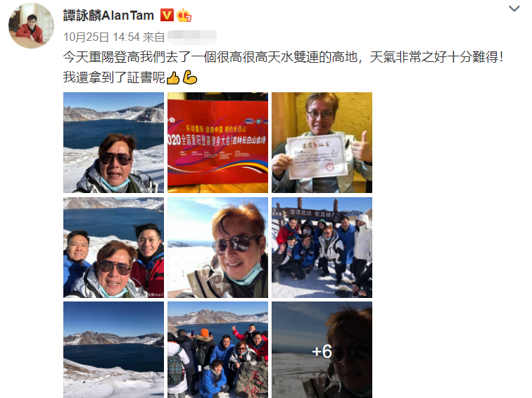 10月25日,谭咏麟在小我社交账号上晒出一组照片,并配文称,重阳登高,我们去了一个很高的天水双连高地,天气非常的好,十分难得,我还拿到了证书呢。