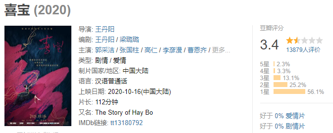 3.4分的一个评分,放在任何一年的电影市场,口碑都无法翻身,都是全年最烂的电影之一。在今年本身电影较少的情况下,《喜宝》的关注度就更高了。