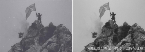 但其实初步上色后的结果不是很理想,很多地方会与历史存在出入。比如志愿军的军装颜色,计算机的结果是灰蓝色,但是真实的颜色应该是黄绿色。