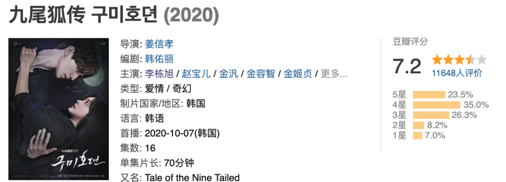 最近更新的几集由于槽点密集,导致《九尾狐传》在豆瓣的分数直线下跌。但,瘦死的骆驼比马大,目前稳定的7.2分,在同类型剧中还是一个不错的成绩。