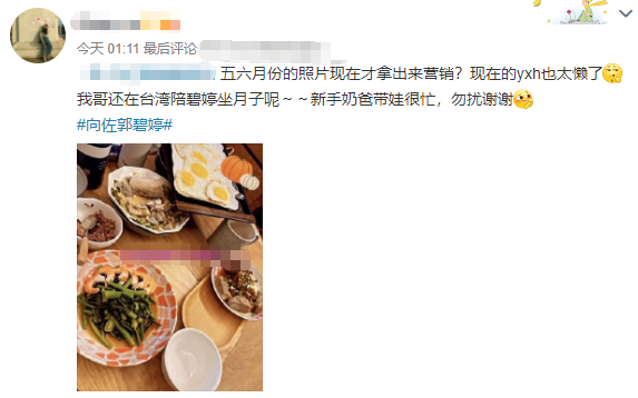 与此同时,也曝光了郭碧婷在月子会所的月子餐,这个照片应该是郭碧婷的好友曝光出来的,照片上还写着“来蹭人家的月子餐”。