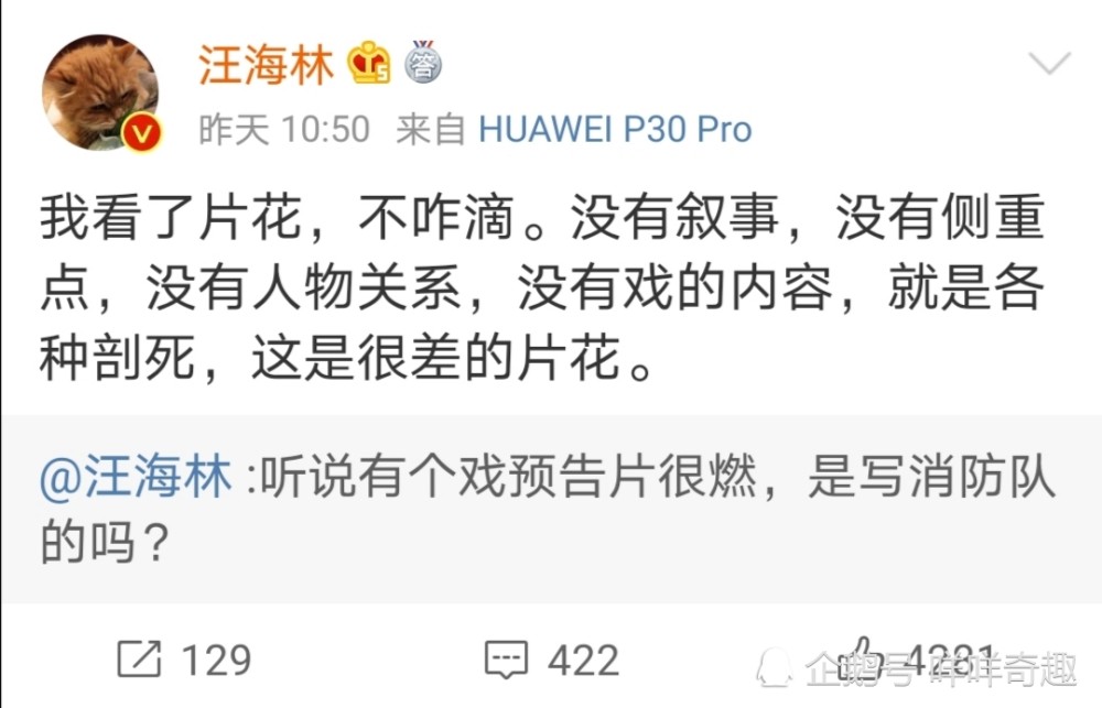 “听说有个戏预告片很燃,是写消防队的吗? ”然后紧跟着又发文称“我看了片花,不咋滴。没有叙事,没有偏重点,没有人物关系,没有戏的内容,就是各种剖死,这是很差的片花。”