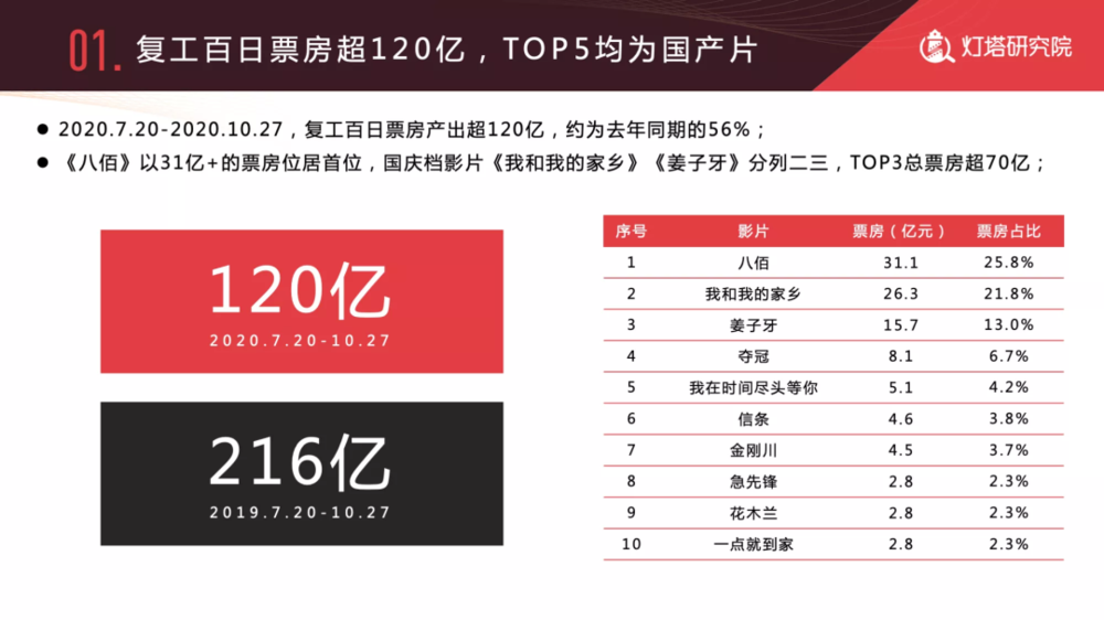 从7月20日电影院正式开门算起,到10月27日为止,中国电影市场复工已经整整100天了。灯塔专业版显示,在这100天的时间里,国内电影市场总票房成绩累计120.32亿,达到去年同期的56%。其中,国庆档8天创造了近40亿的票房,成为仅次于2019年、内地影史第二高的国庆档。
