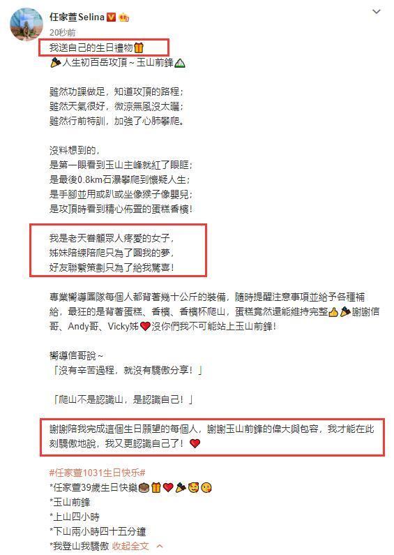 当天下昼Selina本人晒出了自己登上玉山前锋的照片,她在长文中透露,这次的登山之行,是送给自己的生日礼物。还表示在第一眼看到玉山主峰时,就红了眼眶,可见登山并非易事。