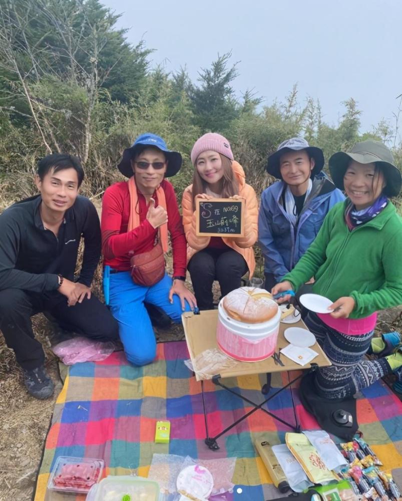 Selina开心与工作职员合照,其实她的庆生会很简单,一张野餐垫加蛋糕香槟,并没有太多华丽的装饰。但相信挑战登山精神,是这些脆而不坚的工具无可替代的。