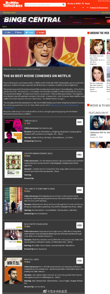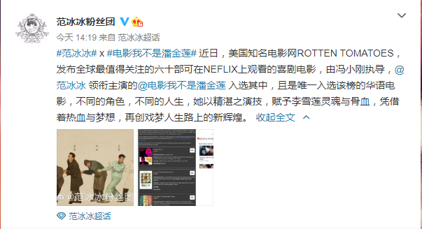 近日,美国知名电影网ROTTEN TOMATOES,发布全球最值得关注的六十部可在NEFLIX上观看的喜剧电影,由冯小刚执导,范冰冰领衔主演的电影《我不是潘金莲》也被入选其中,且是唯一入选该榜的华语电影,再一次彰显了范冰冰的国际影响力。