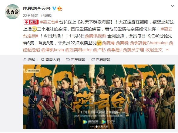 11月3日下昼,电视剧《燕云台》的官方媒体平台终于发出官宣内容,宣布电视剧《燕云台》定档11月3日,会员每日19点40分抢先看6集,首更8集,非会员22点跟播卫视。但是,在《燕云台》的官宣当中,并未提及播出的卫视平台究竟是谁。