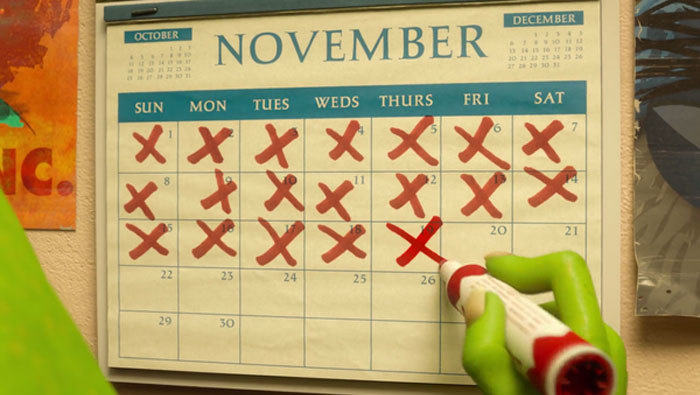 7.在《怪兽大学》,我们可以发现大眼仔在日历上画的标记越来越鲜艳、明亮,之前的颜色都变淡了…这是一部动画电影啊…