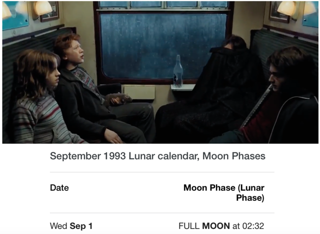 14.在《哈利波特与阿兹卡班的囚徒》中,在开学那天(1993.9.1)前往霍格沃茨的火车上,卢平教授(狼人)大部分时间都在睡觉,这是因为前一天正好是个满月,变身狼人使得他精疲力尽。