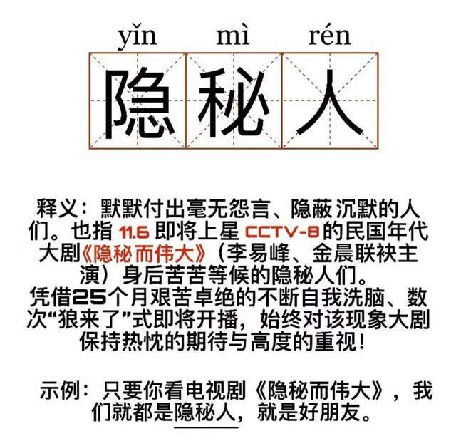 什么是隐秘人?指的是苦多时,始终对该剧保持热忱的期待与高度重视的观众粉丝们。今晚,《隐秘而伟大》就将正式首播,预计一开播就会在社交平台上引发热议,一集几个热搜词提前预定上。正好完全印证了那句老话“酒越陈越香”,“隐秘”了这么久,想必一播出就是轻飘飘的“民国大剧精品”。