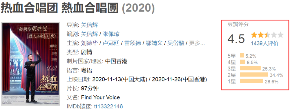 如此同时,《热血合唱团》大规模开画后,豆瓣口碑于周五晚间解禁,超过1000多名观众给予4.5分,很明显,这样的口碑可以和烂片画等号了。