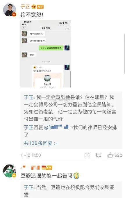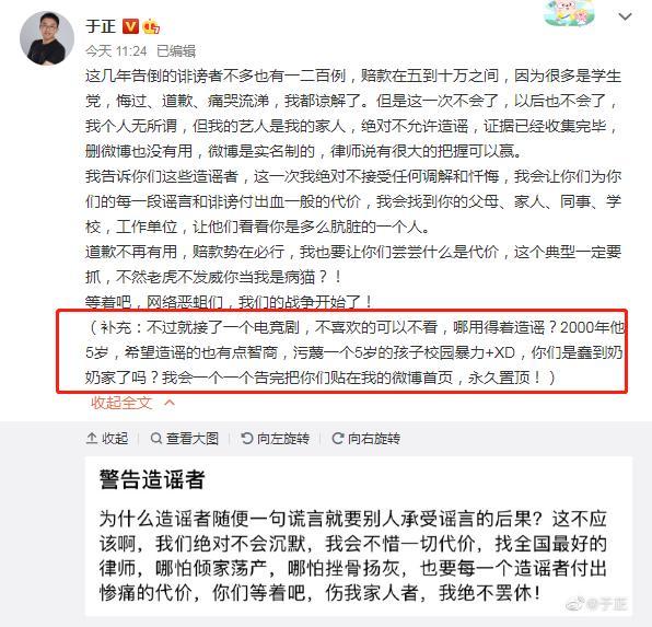 11月12日,于正发布了一条起诉“造谣者”的微博。