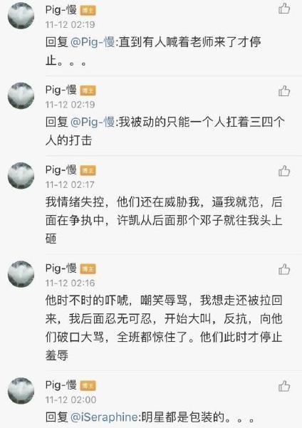 大致经过:某位网友自称是许凯的初中同学,自诉在读书期间经常受到许凯的校园暴力,被他打骂侮辱加威胁,而且还声称许凯在2000年就XD了……