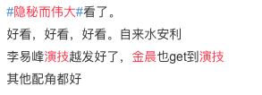 金晨的出演得到了不少网友认可,认为角色拿捏得当,无论是刚出场的交头戏,还是以后身份的转变,都表现的很稳妥。