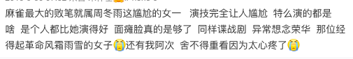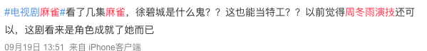 总之,对于《麻雀》这部剧的评价,是远远低于当下的《隐秘而伟大》,而当时吐槽的对象,几乎都是围绕这周冬雨饰演的女主角在进行,可以说她那一次是被群嘲了。