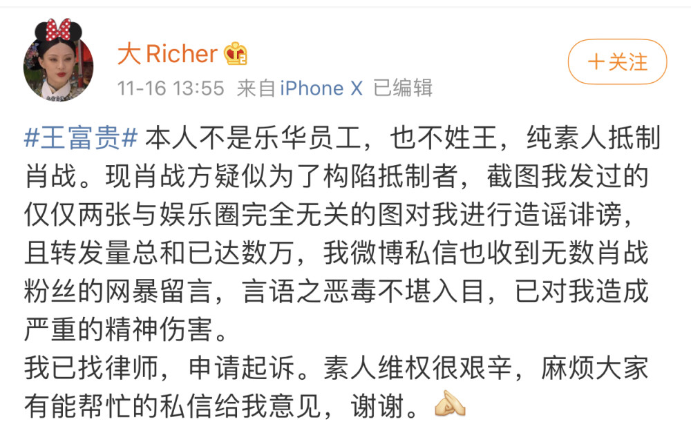 近日,网传网络用户“王富贵”是乐华娱乐的职粉,故意散布消息抹黑肖战 ,随后,王富贵回应称自己不是乐华娱乐的员工,而且自己也不姓王,只是纯真不喜欢肖战。