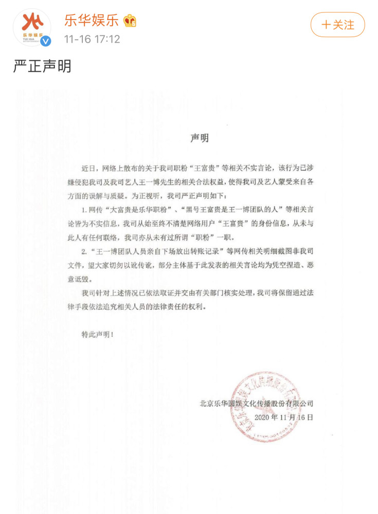 此事引发热议后,乐华娱乐也发声明表示网传“王富贵是乐华职粉”、“黑号王富贵是王一博 团队的人”等相关言论皆为不实信息,网传的转账纪录也并非公司文件。