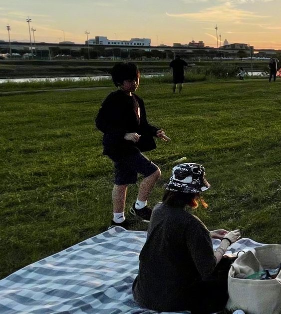 这边孩子们玩得超happy,陈若仪就安静地坐在地毯上陪同,画面真的好温馨好幸福。