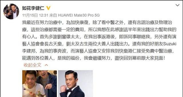 “周星驰爱将”之一的李健仁日前在社交网站向大家报平安,表示现正接受治疗中:“我最近在努力治疗中,为加速康复,除了看中医以外,还有言语治疗及物理治疗,这些治疗都需要必然的费用,所以我想在此感谢这半年来出钱出力帮助我的有心人,包括演艺人协会会长古天乐,为我的事奔波,而演艺人协会又安排我接受免费中医治疗,能遇到各位善人,是我的福分,我会继续努力,尽快回到幕前跟大家见面!”