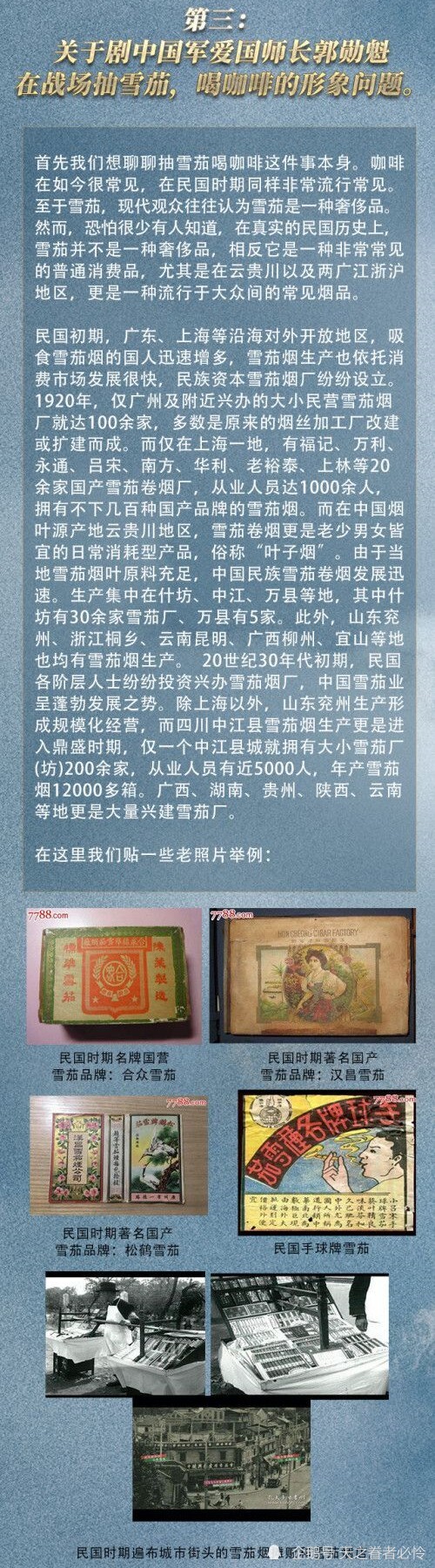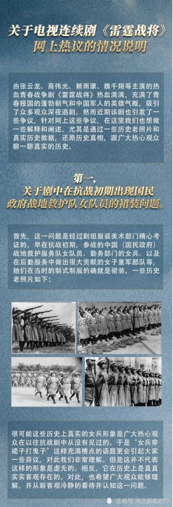近日,号称“亮剑3”的《雷霆战将》被人民日报等官媒点名批评“把偶像剧套路用在抗日题材上”,随后被视频网站和卫视双双下架停播。17日晚,《雷霆战将》官微发长文回应争议,称剧中在抗战初期出现国民政府战地救护队女队员的裙装问题是有历史照片参考的,是真实存在的;对年轻演员不适合出演八路军将领,剧方列举参考的重要原型做年龄与经历对比;回应中国军爱国师长郭勋魁在战场抽雪茄、喝咖啡,称当时这两件物品是常见并流行的。但未对抹发胶、住别墅等问题进行回应。网友都笑侃道:我就想问问发胶是什么牌子的!