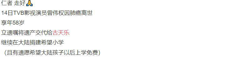 11月14日,TVB老戏骨曾伟权去世,随后,他的遗嘱被曝光,将遗产交给古天乐,用于捐建学校,另,他的最大愿望就是中国小孩上学免费。