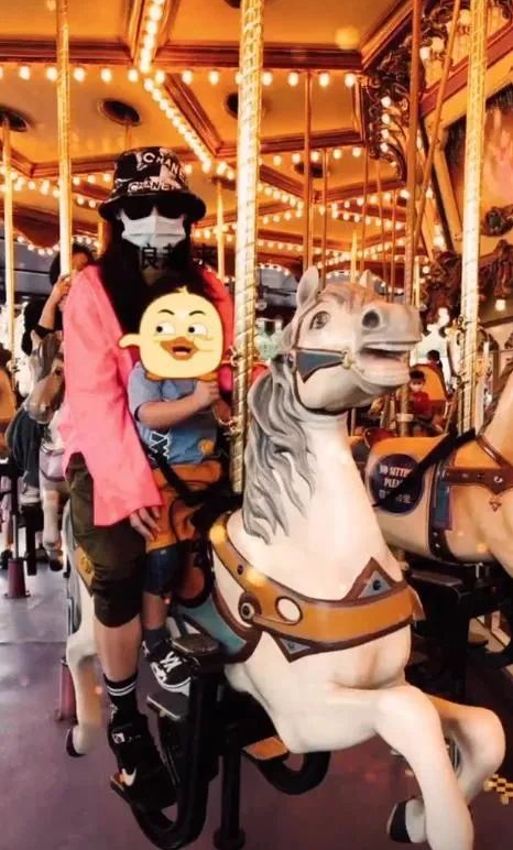 张柏芝与小38岁儿子骑旋转木马,母子俩好开心!由因而穿萝卜裤骑在木马上露出小腿,脚踩一双黑色运动鞋与长筒袜,一身休闲打扮带着孩子游玩很舒适。