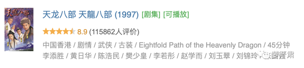 但总的来说,港版金庸影视作品,口碑依然是最高的。即便是张纪中最好评的《天龙八部》(8.3),依然打但是TVB版(8.9)。