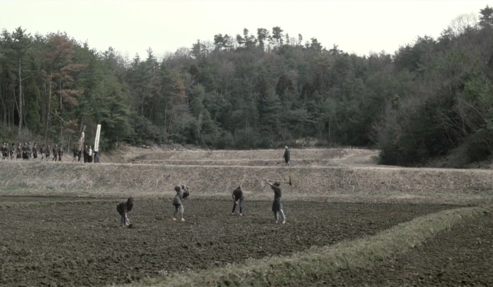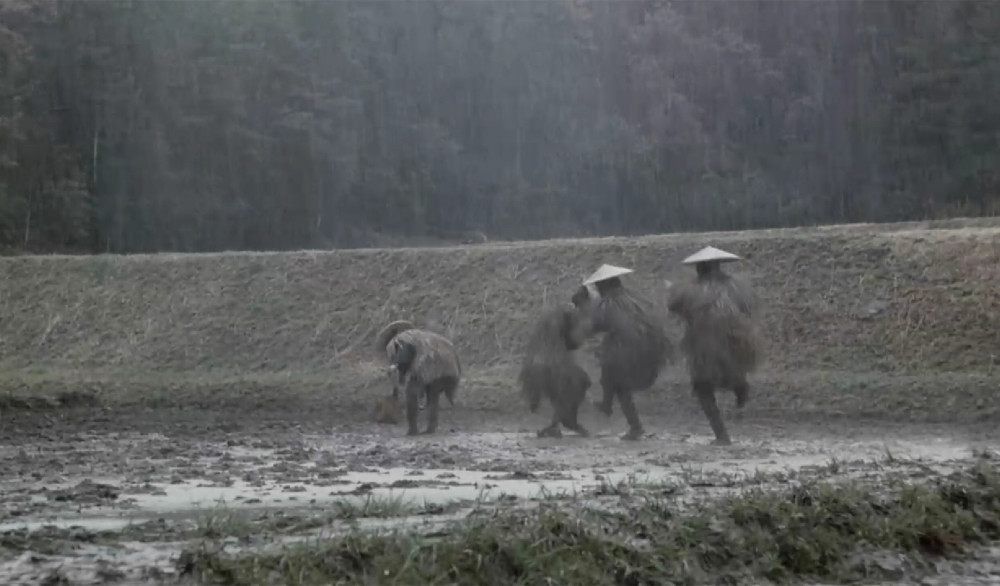 影片第1小时13分,天上下着小雨,四位身穿斗笠的农民在泥泞的水坑里跳着踢踏舞,他们跳舞的节奏也和背景音乐的节奏相匹配,段落以一人摔倒在泥坑中收场,把喜剧做到了极致。虽然我们无法判断跳舞的这四小我是否就是上述劳作的那四小我,但是北野武的目的已经达到了:传达导演的幽默,同时也表达出农民不想参与帮派斗争,只愿恬然自安的简单心愿。