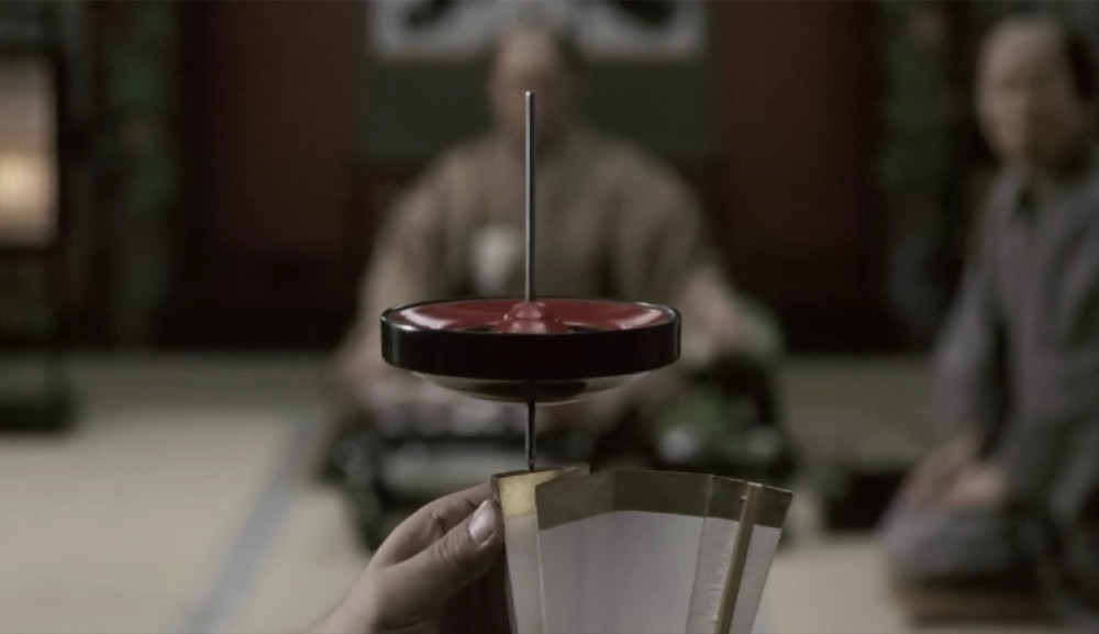 第二,“转陀螺”表演。扇屋在家宴请酒井,席间有艺人表演扇子转陀螺。随着扇面的一点点展开,陀螺仍然能屹立不倒,表现出日本民俗艺人的精湛技艺。“转陀螺”这一传统艺术形式也延续至今,在东京的“江户博物馆”,仍然会每天为到访的游客进行表演。按照我们国内的话来说,“转陀螺”也算是非物质文化遗产了。