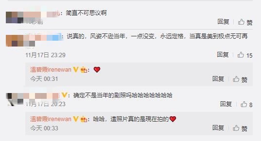 有人赞美温碧霞的风姿不逊当年,已经美到极点无可再美了。另一名网友简直不敢相信自己的眼睛,怀疑温碧霞晒出的就是当年的剧照,后来温碧霞告诉该网友照片真的是现在拍的。