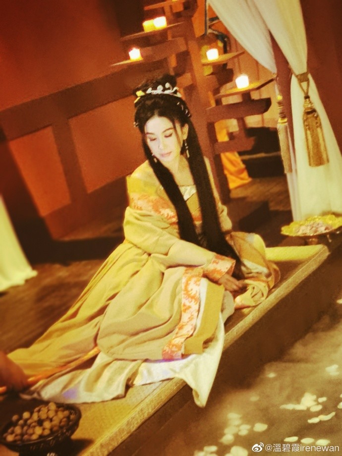 广告照相当精致了,不仅拍摄场地高度还原商朝奢华的宫殿,更让人惊喜的是温碧霞穿上露肩古代服饰再次扮演“病国殃民”的一代妖后苏妲己。