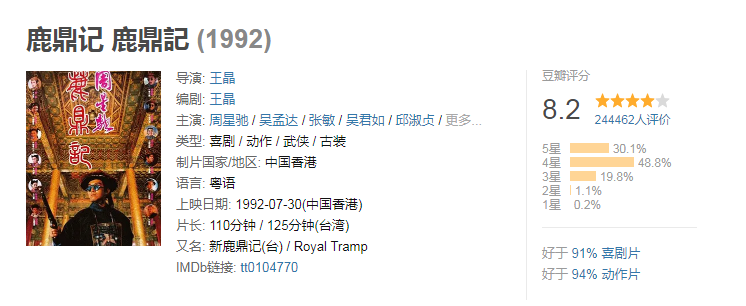《鹿鼎记》上映于1992,是一部由王晶执导,周星驰、吴孟达、温兆伦、邱淑贞、张敏等联合出演的武侠喜剧片。