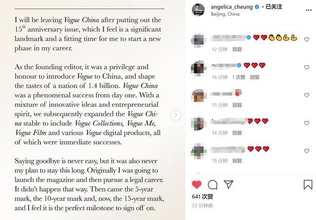 张宇即将离职的消息持续发酵了一天以后,在11月20日下昼,张宇本人在外网社交平台发文证实了离职的消息,称自己即将离开服务了16年的《VOGUE》杂志,即将开始职业生涯的新阶段。
