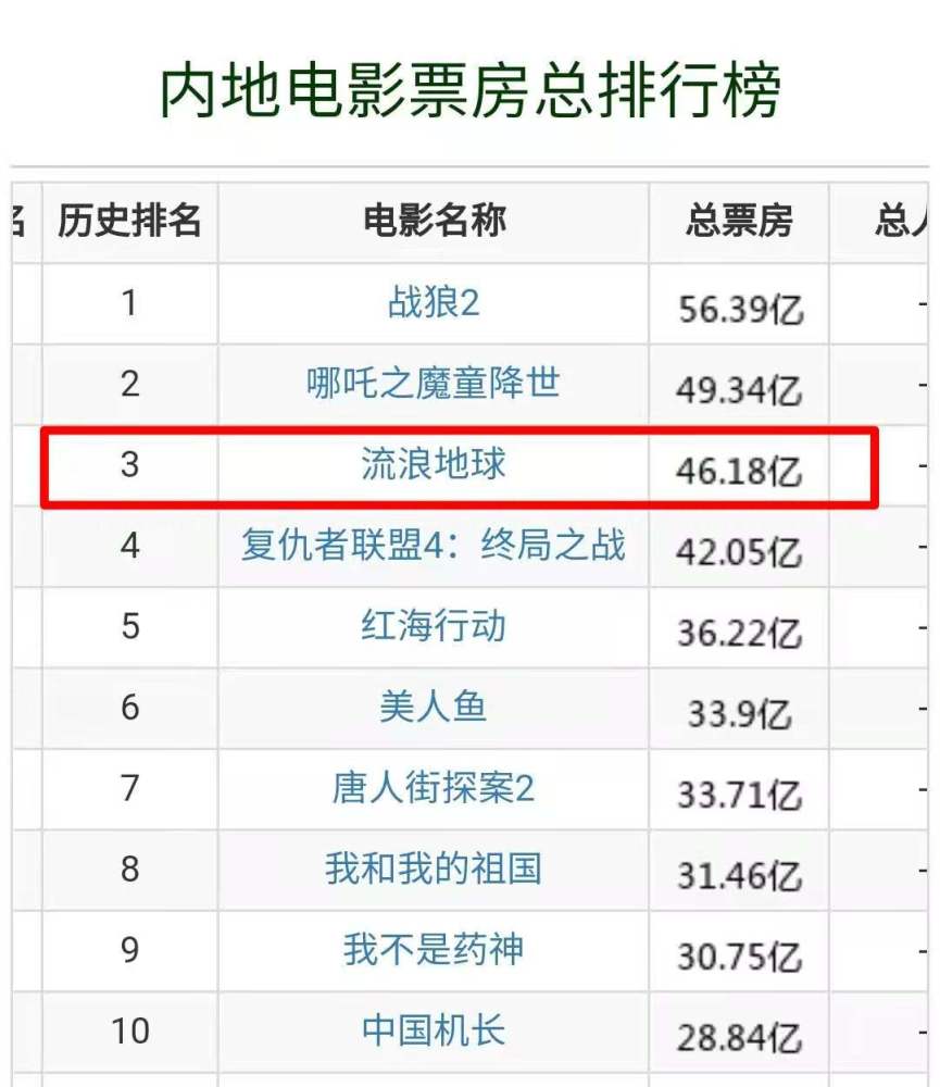 目前中国内地电影总票房第三名,来自2019年上映的《流浪地球》。作为一部并不是十分面向大众题材的电影,《流浪地球》可谓在当年创造了票房奇迹。