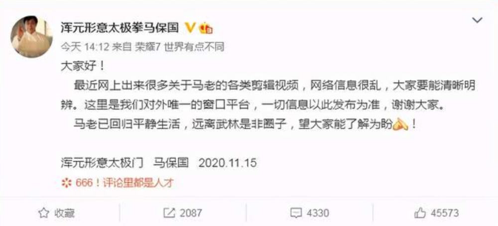 可以说,马保国虽然是沽名钓誉,但他在爆红网络以后并没有像其他鬼畜明星那样进驻B站,或者是签约公司成为一代网红,如果他这么做的话,轻轻松松就能够坐拥百万粉丝的,然而在网上红了以后的马保国,反而在微博上发声说“马老已经回归平静生活,远离武林是非圈子,望大家了解为盼”,这话很清楚地表明了马保国在某方面还是讲武德的。