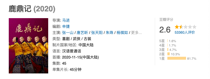 比如在头几天播出的张一山版《鹿鼎记》,同样是名著加持,槽点也是多到数都数不完,评分才2.6。除了剧情bug太多外,一贯演戏不错的张一山演技也翻了车。