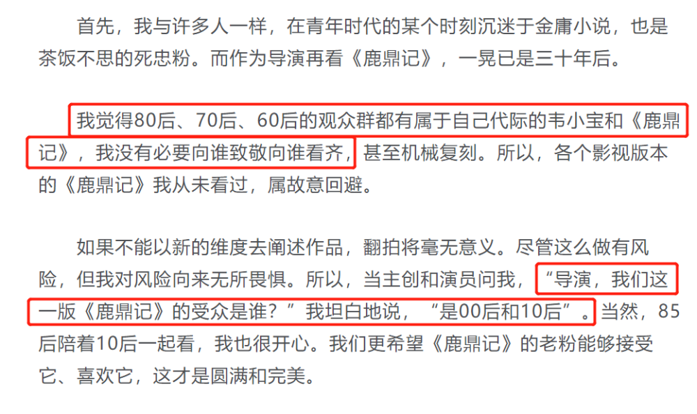 对此,新版《鹿鼎记》的导演马进采访时做出了回应。对于网上恶评如潮,马进坦言自己拍《鹿鼎记》针对的人群是00后年轻人,对于80后、70后和60后来说,都有属于他们那个年代的韦小宝和《鹿鼎记》。从这番话可以看到,马进导演拍《鹿鼎记》是为了讨好年轻人。